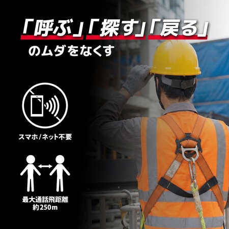 常に会話ができる状態であるため、「呼ぶ」「探す」「戻る」などで起こるコミュニケーションロスを減らし、作業効率を上げると共に、異常や危険なども即時に共有できるため、安全性も高めることができるデバイスとなります。