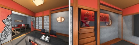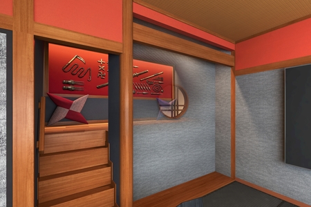 新設する客室「イーストウイング 忍者ファミリールーム」は、「火の国」熊本をイメージした「赤」と、忍者をイメージした「黒・灰色」を基調とした落ち着いた雰囲気のモダンな和洋室でスタイリッシュなインテリアを設えながら、隠し部屋、忍者をイメージしたアートなど意匠が散りばめられたユニークなコンセプトルームとして登場いたします。お布団4組、ソファーベッド3台に加え、隠し部屋にもお布団を敷くことができ最大7名様まで宿泊可能です。親子三世代の家族旅行や、お子様を中心とした子連れ旅などお子様がワクワクしながらホテル滞在が楽しめる客室です。