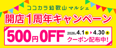 「ココ・カラ。和歌山マルシェ」は、和歌山県内8JAが令和7年4月1日に合併したのに合わせ、旧6ショップが一緒になりオープンしたショップで、和歌山県が生産量日本一を誇る梅、ミカン、柿などの青果物や、梅干、ジンジャーエールなどの農産加工品に加え、野菜や花、熊野牛など充実した商品を取り揃えているショップです。開業1周年記念としてお得な割引クーポンを発行します。ぜひこの機会にご利用ください。