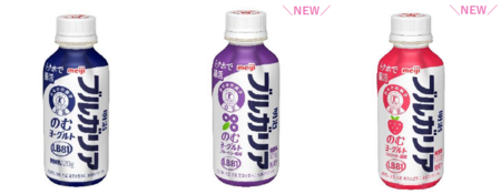 今回、「明治ブルガリアのむヨーグルトLB81」(ONE SHOT・120g)に加え、新たにブルーベリー風味(無果汁)、ストロベリー風味(無果汁)を追加し、全3種のフレーバーにラインアップを拡大して発売します。