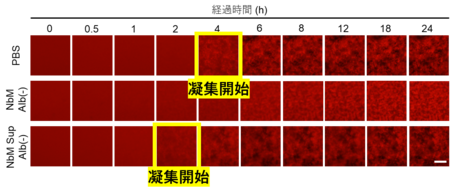 Aβは、一般的な実験で用いられる生理的塩濃度の溶液(PBS)よりも培養上清中で早期に凝集開始し(PBS約4時間、培養上清約2時間)、細胞分泌由来の低分子やAβオリゴマーが凝集促進に寄与することを示しました。