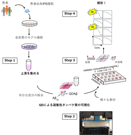 本研究では、室蘭工業大学が開発した量子ドット(QD)によるAβ凝集過程の可視化法を応用したタンパク質凝集抑制物質の微量ハイスループットスクリーニングシステム(特許第7166612号、PCT/JP2019/51077)と、株式会社カネカ 再生・細胞医療研究所のiPS細胞培養技術を組み合わせ、患者iPS細胞から分化誘導した神経細胞の培養上清中で凝集阻害物質をスクリーニングする新たなスクリーニング手法 High‑throughput screening technology for Aggregation Inhibitors of Diseased cell‑derived Aggregative Proteins (HaiDap)を開発しました。