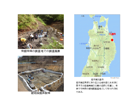 今回の歯化石が発見された場所は、岩手県久慈市小久慈町にある久慈琥珀博物館が運営する琥珀採掘体験場と、当博物館が早稲田大学と共同で発掘調査を行っている場所から南に位置する堀内です(現在は採掘を中止)。この地域に分布する久慈層群玉川層(後期白亜紀;約9000万年前.火山灰の放射性年代測定による)では、2012年3月から平山廉教授らによる発掘調査が実施されてきました。これまでに竜脚類(大型植物食恐竜)、獣脚類(肉食恐竜)、カメ類、ワニ類、コリストデラ類(絶滅した水性爬虫類)、サメ類など30種類、3500点を超える脊椎動物化石が発見されています。