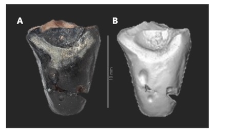 久慈層群玉川層から産出した角竜類の歯化石(OSD315)。A、化石の外側観; B、CTデータをもとに立体構築した3Dモデル