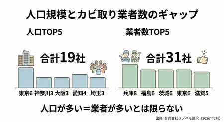 調査方法:インターネット上の事業者情報および地図情報サービス等の公開データを基に、カビ取り・カビ除去・防カビを専門に掲げる事業者を都道府県別に独自集計(重複除去済み) 調査主体:合同会社リノベモ 編集部