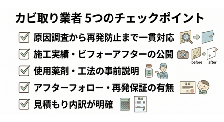 リノベモでは、消費者がカビ取り業者を選ぶ際のポイントとして以下を推奨しています。
