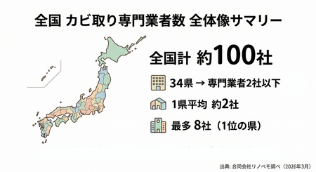 調査の結果、全国のカビ取り専門業者数はわずか約100社にとどまり、34県では専門業者が2社以下であることが明らかになりました。