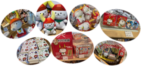 例:ひこにゃんぬいぐるみ、キーホルダー、文房具、お菓子、その他関連商品など