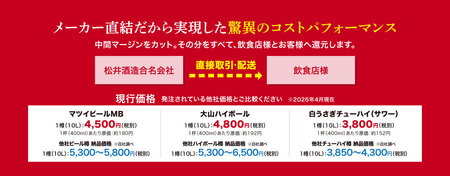 松井酒造は、常に飲食店様を第一に考えます。「コストを抑えたいが、品質の妥協はしたくない」という切実な声に、私たちはこの「マツイビール」の品質と固定価格でお応えします。ぜひ一度、その品質と価値をお確かめください。
