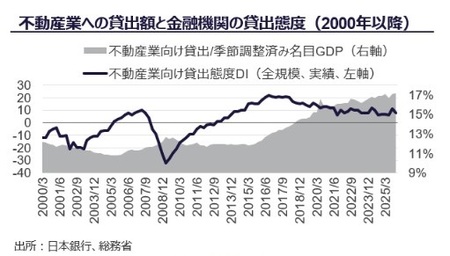 日本の実質GDP成長率は2026年を通して緩やかなプラス成長が見込まれる一方、米国の通商政策や世界経済の減速懸念など、外部環境の不透明感は依然として残る。こうした中、日本銀行は金融正常化の方向性を維持しつつ慎重な政策運営を継続している。不動産業向け貸出残高は名目GDP比で高水準を維持しており、金融機関の貸出態度も概ね前向きである。長期金利は2%台へ上昇したが、この金利上昇局面においても、事業用不動産ではオフィスや賃貸住宅をはじめとして、賃料上昇と高稼働率を背景にファンダメンタルズは底堅く推移している。株価上昇の影響でJ-REITの分配金利回りは縮小したが、NAV倍率は上昇し、足元では収益性や資産価値に基づく評価が意識され始めている。