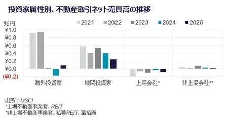 一方、ホテル、賃貸住宅、物流施設では2024年の大型ポートフォリオ取引の反動により、2025年は取引額が前年を下回った。データセンター市場における2025年の年間取引量も、前年実績を下回った。これは、前年にブラックストーンによるAirTrunkの大型買収による反動減が主因である。ただし、AI関連需要の拡大を背景に、市場取引は引き続き堅調に推移している。買主属性を見ると、円安や収益環境の安定性により、 2025年の海外投資家によるネット売買高(取得額から売却額を差し引いた額)は883億円と、前年の-1,783億円から大幅な買い越しに転じた。