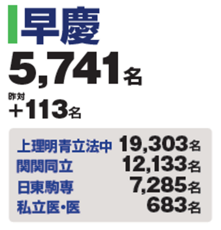 私大最難関の「早慶」では5,741名が現役合格。早稲田大学の現役合格者は、東進史上最高となっています。「上理明青立法中」「関関同立」では、複数の大学で合格者数が大きく減少し、ボーダーライン付近の受験生には厳しい年となりました。しかし、東進生は「上理明青立法中」で19,303名、「関関同立」で12,133名と多数の生徒が現役合格しています。