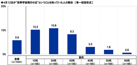 「4月12日が“世界宇宙飛行の日”ということを知っていた」6%、20代では11%