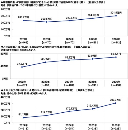 ここで、過去の調査結果(※)と比較すると、宇宙船に乗って宇宙旅行(1週間)に行きたいと思える旅行金額の平均は、2022年233.7万円→2023年209.6万円→2024年229.6万円→2025年264.5万円→2026年301.5万円と、調査開始以来はじめて300万円を突破しました。
