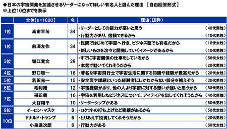 選んだ理由についてみると、1位の高市早苗では「リーダーとしての能力が高いと思う」や「行動力があり、信頼できるから」、同じく1位の前澤友作では「民間ではじめて宇宙へ行き、ビジネス面でも有名だから」や「新しいものを次々と開発していくイメージがあるから」、3位の堀江貴文では「すでに宇宙関係の仕事をしているから」や「本気で動いてくれそうだから」といった回答が挙げられました。