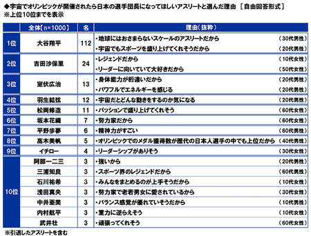 選んだ理由をみると、1位の大谷翔平では「地球にはおさまらないスケールのアスリートだから」や「宇宙でもスポーツを盛り上げてくれそうだから」、2位の吉田沙保里では「レジェンドだから」や「リーダーに向いていて大好きだから」、3位の室伏広治では「身体能力が桁違いだから」や「パワフルでエネルギーを感じる」といった回答が挙げられました。