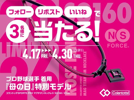 磁気健康ギア「Colantotte(コラントッテ)」の製造・販売元である株式会社コラントッテ(本社:大阪市中央区、代表取締役社長:小松 克已)は、磁気ネックレスの人気モデル「コラントッテSPORTS PRO マグチタンネックレス SG160」より、母の日に向けた特別モデル“ローズピンク”(価格:30,800円/税込)を発売いたします。