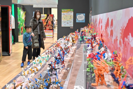 迫力満点の超合体ザウルスも集結。定番から約2倍の大きさの「メガ」シリーズ、ブロック遊びを強化した「ブロックス」シリーズまでもがそろうのは、この展覧会しかありません。記念撮影できるフォトスポットのほか、「組み方」を解説した動画も放映されており、いろんな楽しみ方ができる展覧会です。
