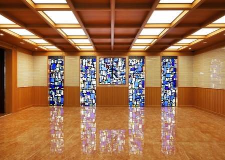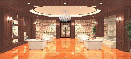 木目調の精緻な意匠棚、そして風合い豊かな石積みの壁材を組み合わせ、洗練されたデザインを実現しました。空間の中央に配された華やかなシャンデリアと、壁面の噴水による水のせせらぎが、居住者や来訪者を穏やかに迎える上質な安らぎを創出しています。