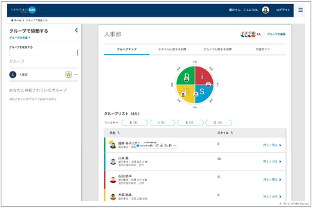 カタリストは「自分と他者の個性の違い」に関する学びを一過性のものにせず、日常業務の中で活用することを前提に設計されています。主な機能として「①比較機能」「②グループ機能」があり、オンライン上でいつでもアクセスできます。