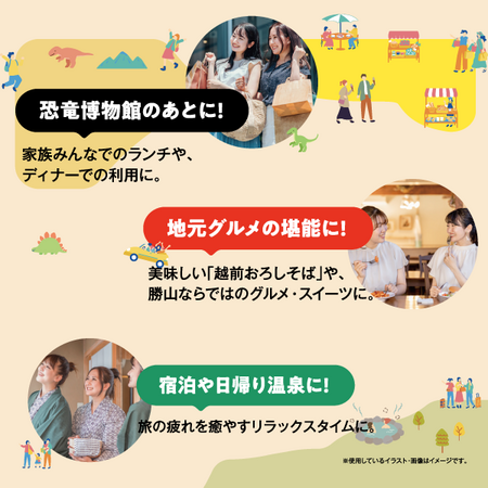 恐竜博物館のあとのランチやディナー、越前おろしそばなどの地元グルメの堪能、宿泊や日帰り温泉など、勝山市でのさまざまなシーンでご活用いただけます。