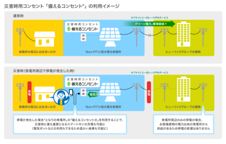今回開発する非FIT小型太陽光発電所には、クリーンエナジーコネクトが提供する「備えるコンセントⓇ」を導入しています。「備えるコンセントⓇ」とは、発電所の設置地域で災害等により停電が発生した際、周辺にお住まいのみなさまが太陽光発電で発電した電気を利用することができる、災害時用コンセントです。これにより、発電所の設置地域における災害時の停電対策(レジリエンス向上)に貢献することを目指します。