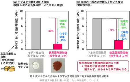 そこで、リンの影響で高い付着性を有することを再現した灰のモデル化合物に対し、化学的・物理的効果が発揮されるよう鉄系薬剤(硫酸鉄水溶液)を鉄添加量が10wt%となるよう、灰を鉄でコーティングしました。添加効果を、上述の粉体層強度測定装置を用いて定量化した結果、900℃における粉体層強度が、薬剤添加しない場合と比べて最大で83%も低下しました(図3 (a))。また、薬剤コーティングによって粒子径が増加したことを確認しました。解析の結果、化学的効果と物理的効果の組み合わせで灰の高温付着性を大幅に抑制できたことが分かりました。さらに、実際の下水汚泥燃焼灰に対しても本手法の実用性を検証しました。実際の下水汚泥燃焼灰はリン以外にもさまざまな成分を含んでおり、カリウムなど一部の成分はリンと同様に付着の原因になることが知られています。検証の結果、リン以外の付着原因が考えられる灰に対しても今回開発した薬剤コーティングによって粉体層強度が劇的に低下することを確認し(図3(b))、実際の燃焼灰にも適用できることを示しました。