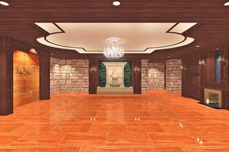 木目調の壁面と端正な天井意匠、重厚感のある石積みの壁材を組み合わせ、上質で落ち着きのあるエントランス空間を創出しました。エントランス中央には華やかなシャンデリアを配し、柔らかな光が訪れる人を優雅に迎え入れます。噴水の水音と景観が重なり、穏やかで落ち着いた雰囲気を醸し出しており、穏やかな時間の始まりを感じさせるエントランスです。