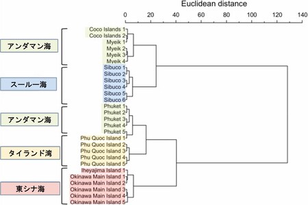 2)ICP-MSおよびICP-OESにより得られた各産地に共通して検出された7元素を用いたクラスター分析(※5)の結果、各試料はおおむね海域ごとにグループにまとまる傾向を示しました(図3)。