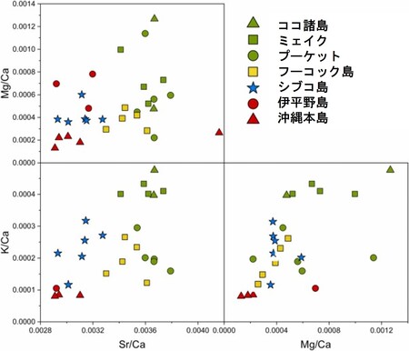 3)Sr/Ca、Mg/Ca、K/Caの元素比は、生息海域ごとに特異的な値であり、Sr/CaとMg/Ca、Sr/CaとK/Ca、Mg/Caと-K/Caのそれぞれの散布図では、各個体はおおむね海域ごとにまとまりました。これらの元素比を指標とすることで、産地同定が可能であることが明らかになりました(図4)。