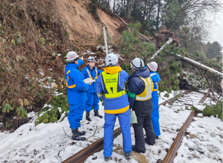 また、自然災害等で被災した地域の鉄軌道施設等の早期復旧を支援するため、被害状況の調査などの技術的支援を行う「鉄道災害調査隊(RAIL-FORCE)」を2023年4月に発足し、高い技術力を生かした災害地域支援にも取り組んでいます。