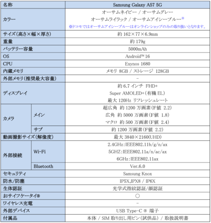 <主な仕様:「Samsung Galaxy A57 5G」>