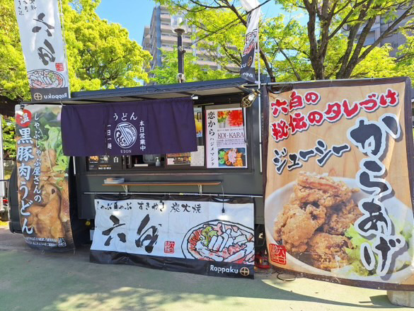 当店人気のからあげ、チーズinメンチカツ、黒豚しゃぶしゃぶのお肉を使った肉うどんをキッチンカーで販売します!