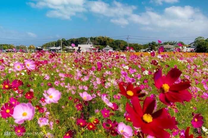遺跡の花畑では、毎年10月中旬頃になると満開のコスモスのじゅうたんを