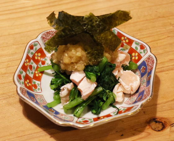 その上にしっとりと火を通した鶏ささみをのせ、山葵を効かせた大根卸を重ね、刻み海苔を添えて出てきました。