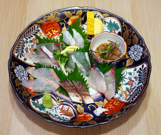 有田焼の大皿にずらりと並べられた刺身は大判で食べ応えのある切りつけになり、