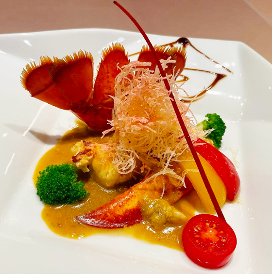 オマール海老の身は、ガーリックバターでソテーし、頭を潰して作るビスクソースをかけています。
