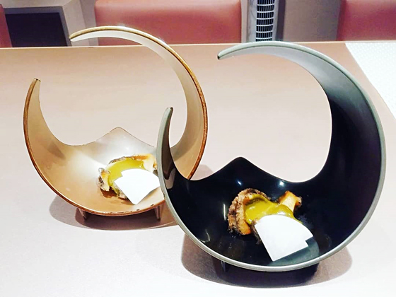 生のアワビを蒸し、肝は裏ごしして酒、バルサミコ、マヨネーズなどで仕上げた独自の濃厚肝ソースを添えたものです。
