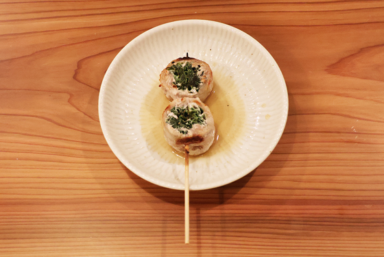 鶏肉ミンチにニラなどを加えて甘めのタレを塗った手作りのつくねです。