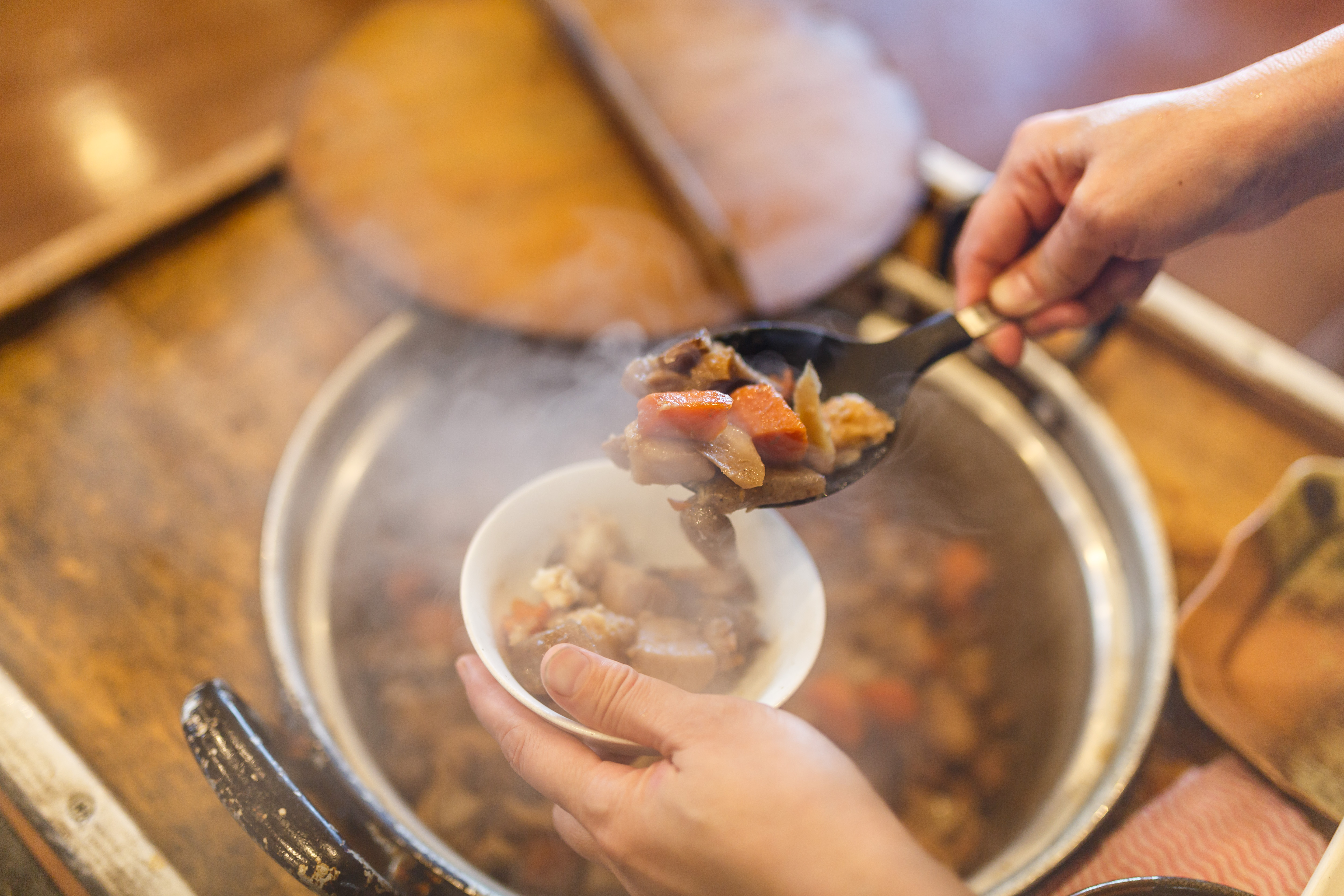 ※レストランの看板メニューで、薪で炊いたごはんを提供。おかわり1回可能。