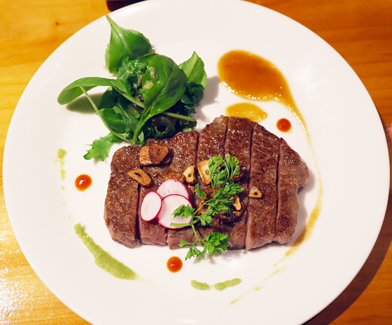 牛肉は鉄板で焼きながら休ませることで火を通し過ぎず、中までいきわたらせています。