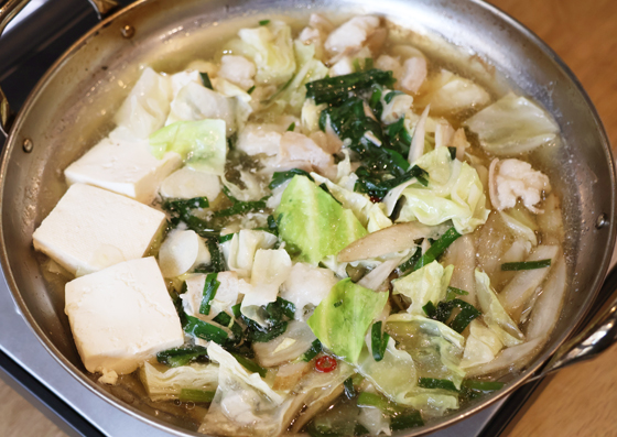具材は、国産牛もつ(小腸)、キャベツ、ニラ、ゴボウ、豆腐、ニンニク。