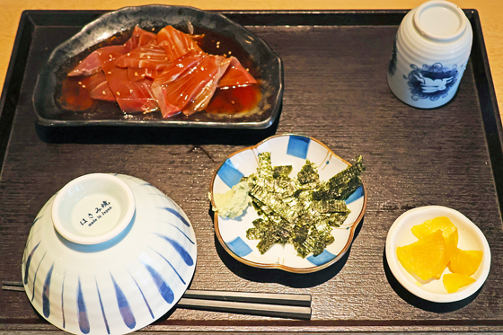 漬けになった鰤と御飯、海苔、山葵、出汁が出てきます。