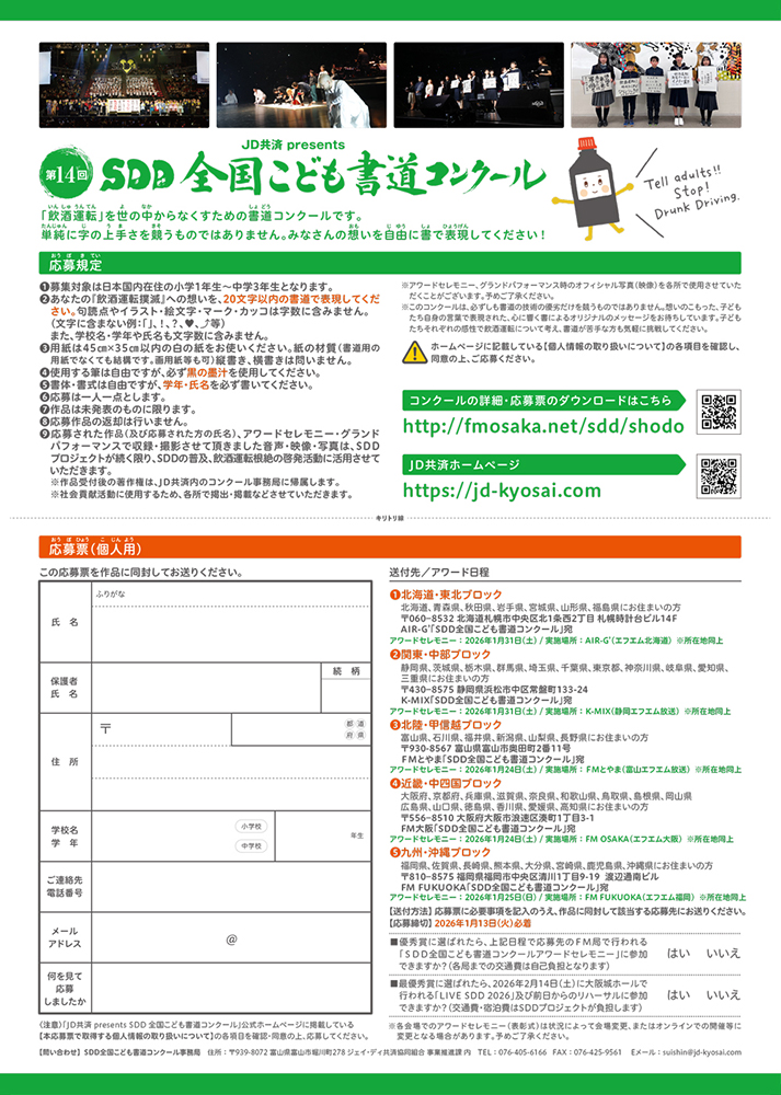 FM FUKUOKAとジェイ・ディ共済から「SDD全国こども書道コンクール」開催のお知らせです。