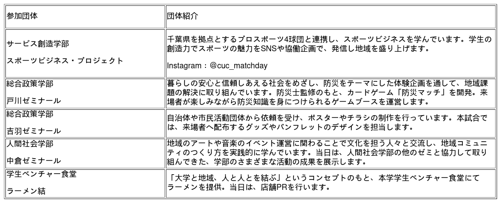 当日は、学生の日頃の活動成果やアイデアを生かしたイベント、パフォーマンス、ブース出展など多彩な企画で試合を盛り上げます。多くの皆さまのご来場をお待ちしております。