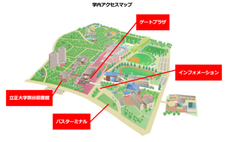 熊谷駅南口より国際十王バス立正大学行または森林公園駅行に乗車(約10分) 立正大学下車