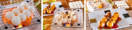 香ばしさ引き立つ、焼きたて団子。思い出に残る焼きみたらしをご体験いただけます。焼き時間は約10分、ロビーに設置した七輪でごゆっくりお楽しみください。