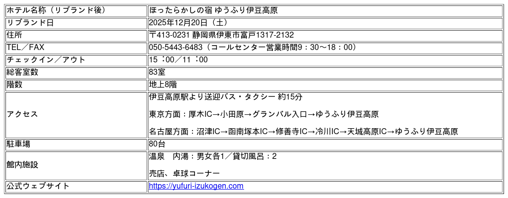 2つのホテルが1つになり「ほったらかしの宿 ゆうふり伊豆高原」に