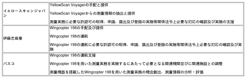 イエロースキャンジャパン株式会社(本社:東京都調布市、代表 トリスタン・アルイ、以下「イエロースキャンジャパン」)は、伊藤忠商事株式会社(本社:東京都港区、代表取締役社長COO:石井 敬太、以下「伊藤忠商事」)、株式会社パスコ(本社:東京都目黒区、代表取締役社長:高橋 識光、以下「パスコ」)と、航空測量における固定翼式ドローンの実用化に向けた協業に関する基本合意書(以下「本合意書)を締結いたしました。