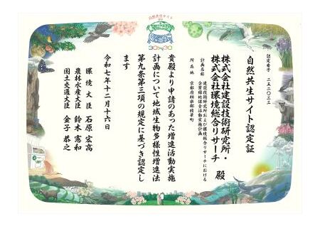 株式会社建設技術研究所(本社:東京都中央区、代表取締役社長:西村 達也)とCTIグループの株式会社環境総合リサーチ(本社:京都府相楽郡精華町、代表取締役社長:西山 勝栄)は、環境総合リサーチ社屋のある「ER&Sけいはんなの共生草地」について、環境省が定める「自然共生サイト」に認定され、2026年1月13日に執り行われた令和7年度第2回自然共生サイト認定式において、認定証を受理しました。